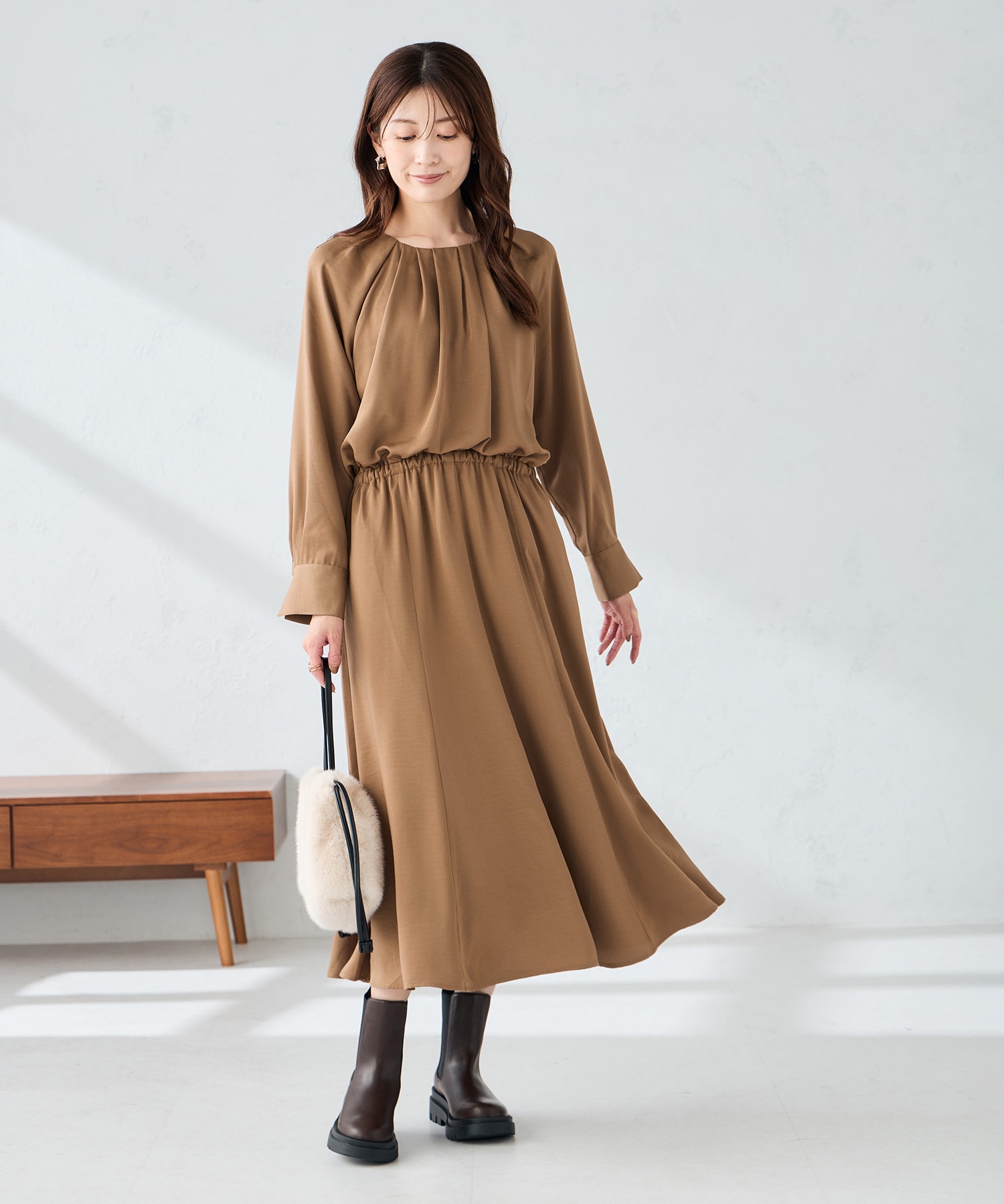 カジュアルにも着こなせるキャメルのサテンワンピースは