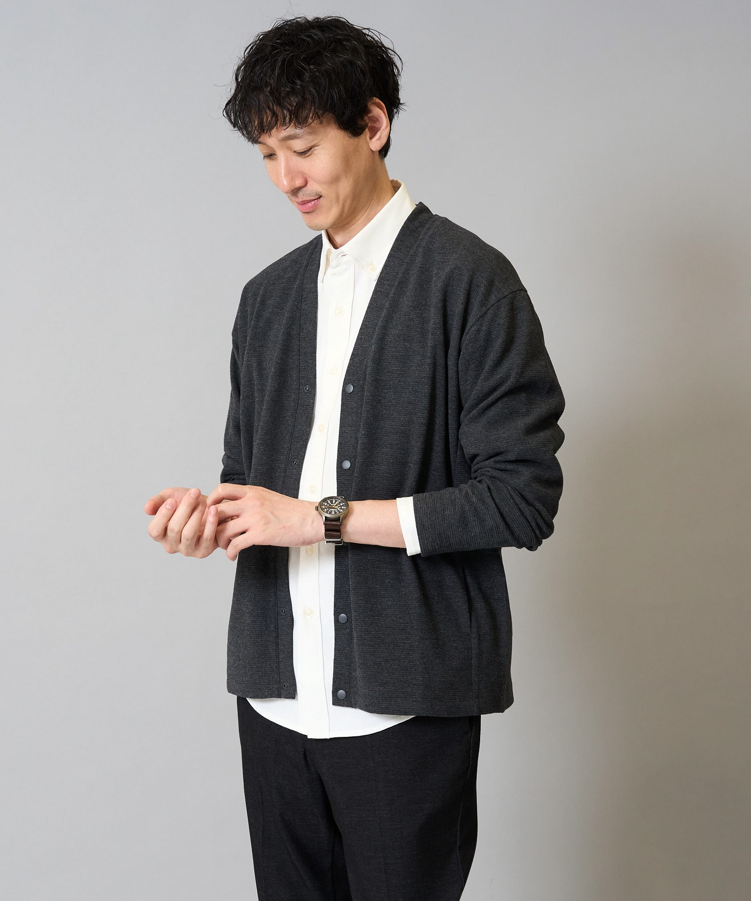 メンズのシルエットが美しいシンプルカーディガンは、上品さとリラックス感を兼ね備えた大人のためのアイテム。