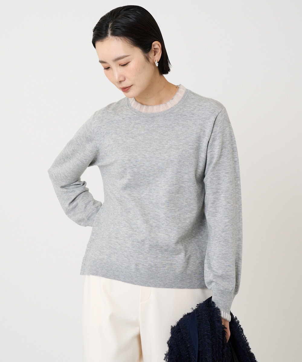 ハイネックニットは、袖と首元にあしらった繊細なフリルが大人可愛い魅力を放ちます。