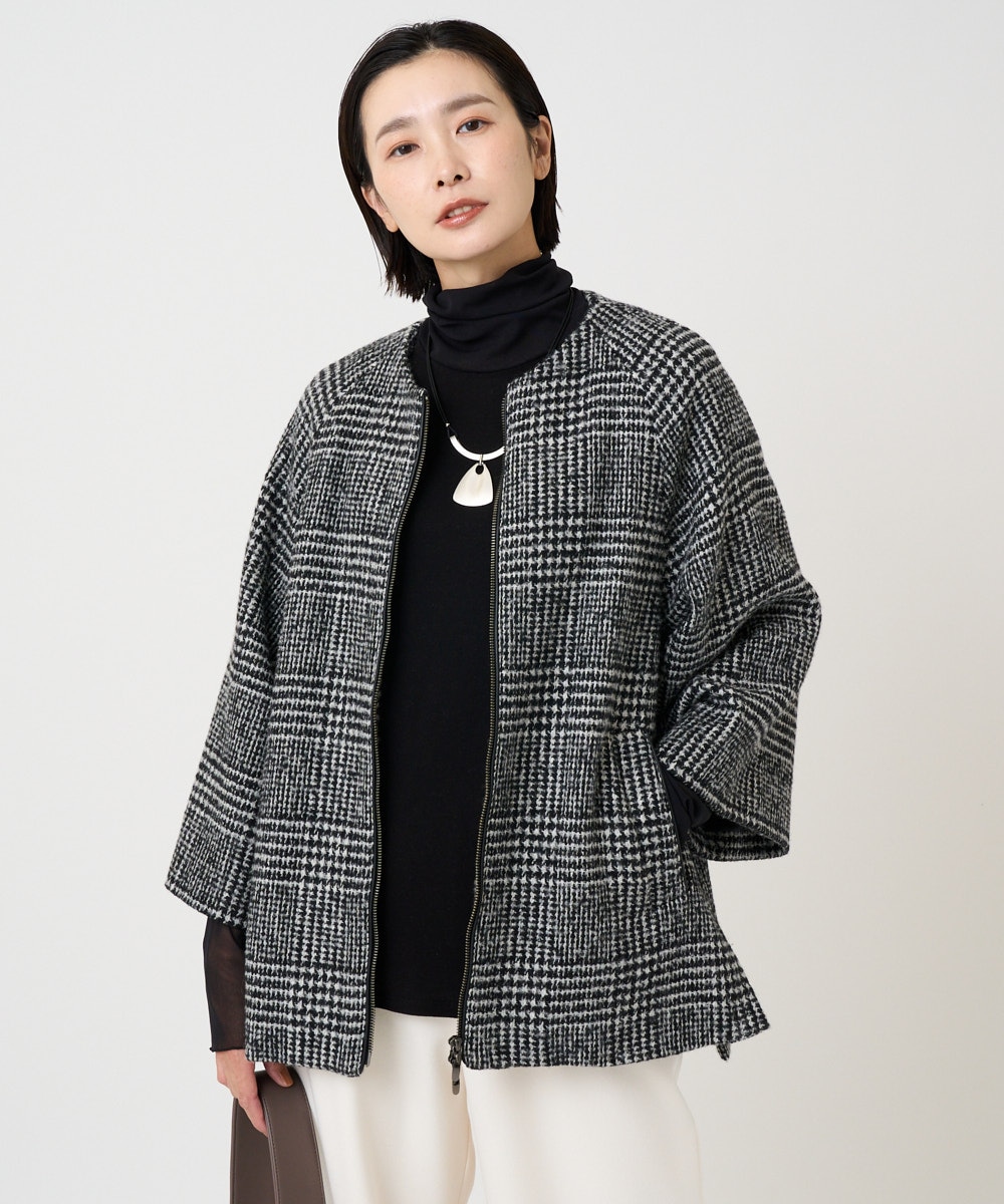 シルクウールのグレンチェックポンチョジャケットは、クラシカルなムード漂うレトロな柄とやや広がるシルエットで、上品な印象を与えます。羽織るだけでグッとお洒落度がアップします。