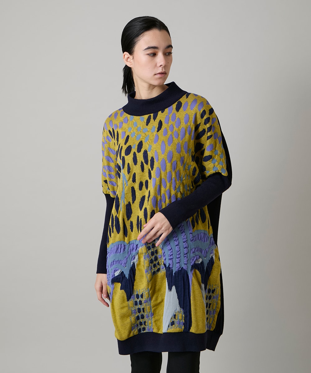 膨れジャガードの凹凸感ある質感のニットにリブ配色したコレクション柄のワンピースチュニック。