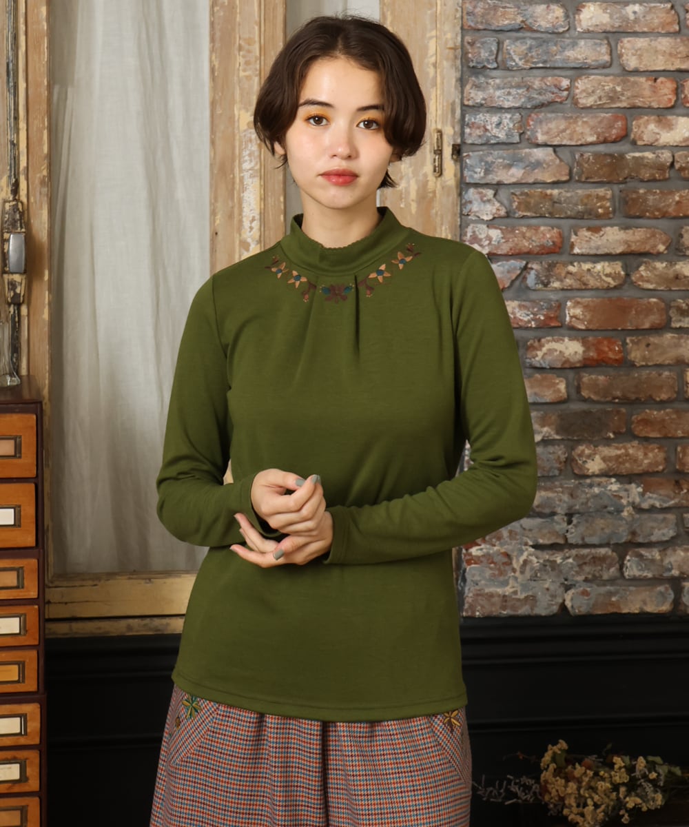カットソーは密着しすぎず高すぎないハイネックで、首元を包み込み寒さ対策にもなります。