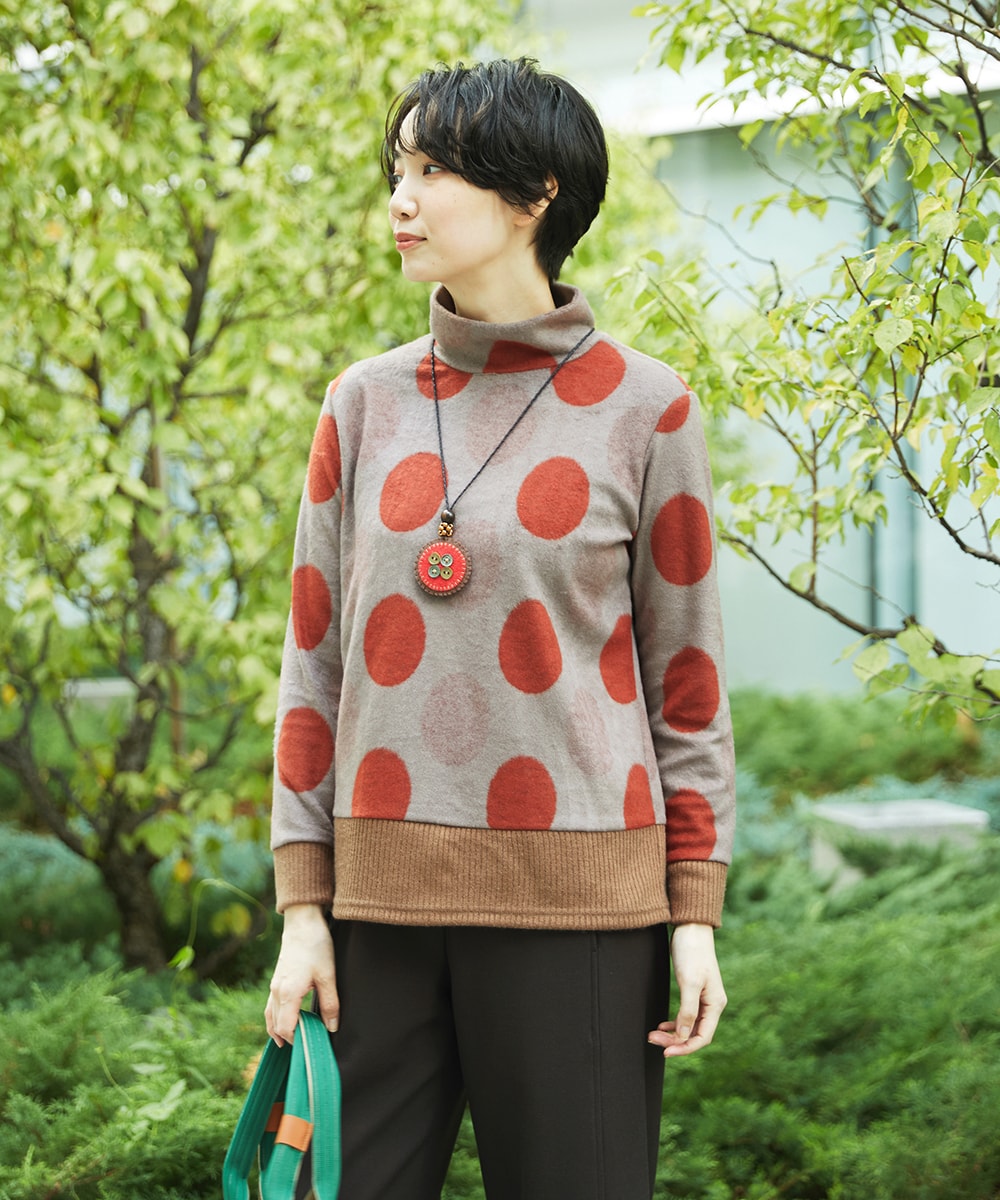 ドットカットソーは、大きいドット柄が映えるシンプルなハイネックと、裾・袖口の異素材リブ使いがアクセント。