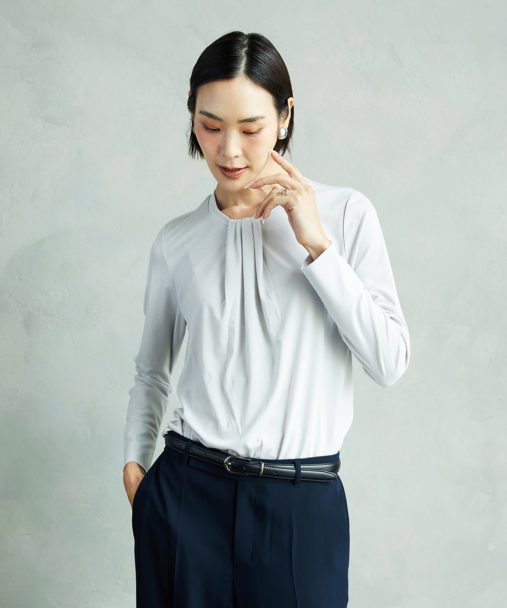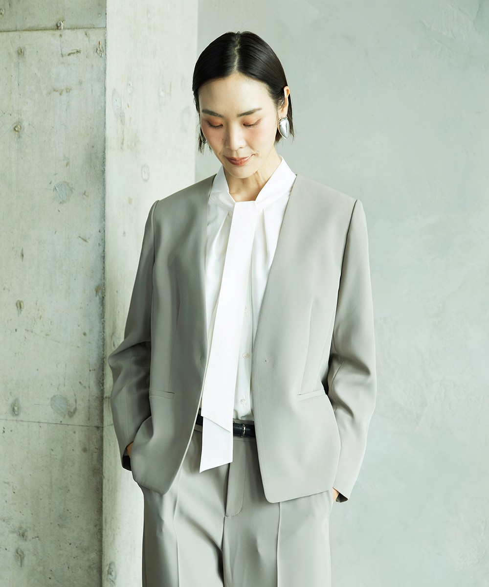 マニッシュなシルエットはハンサムな印象。伸縮性のよいストレッチ素材で