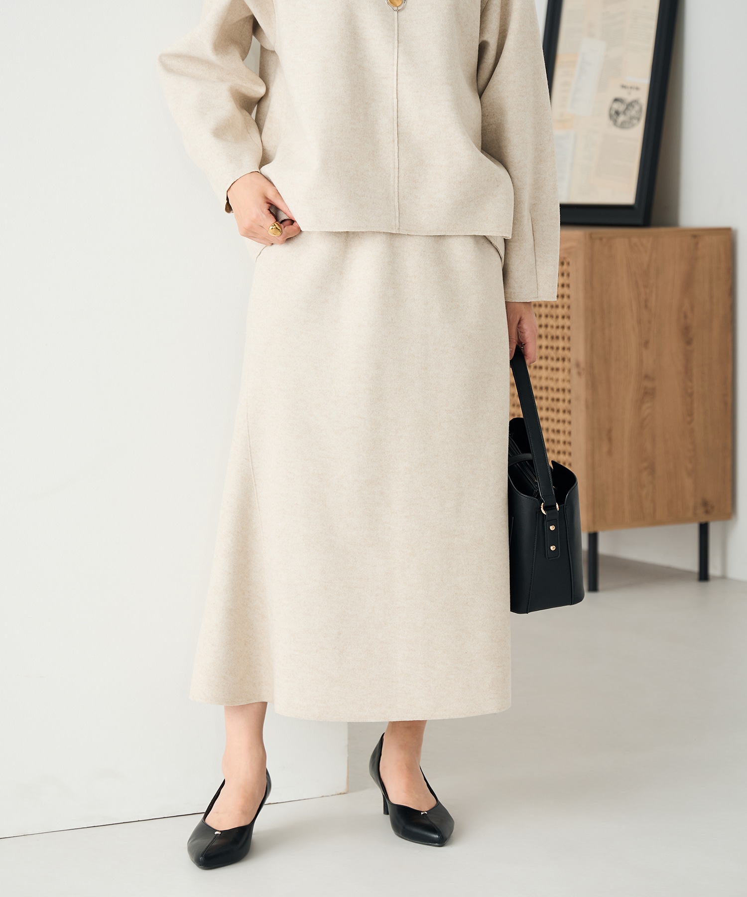 インナーのニットとスカートを同色のベージュにして