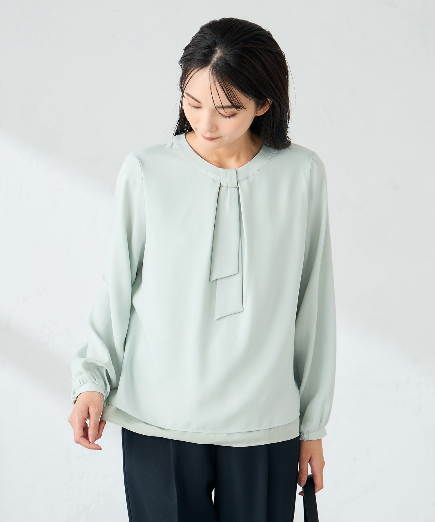 優しいグリーンが女性らしいブラウスです。