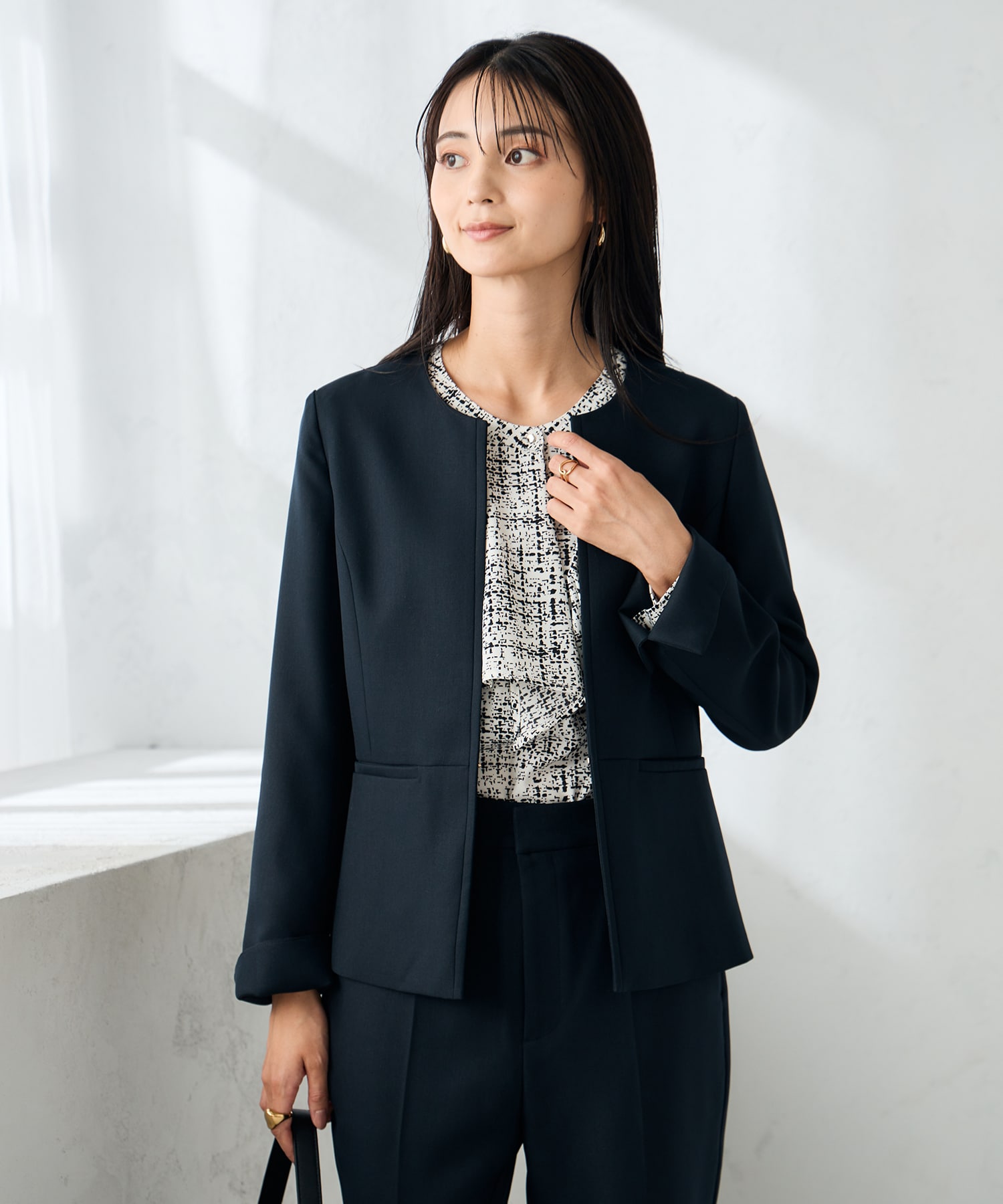 スカート、ワンピース、パンツなどトップスを選ばず女性らしいシルエットのジャケット。