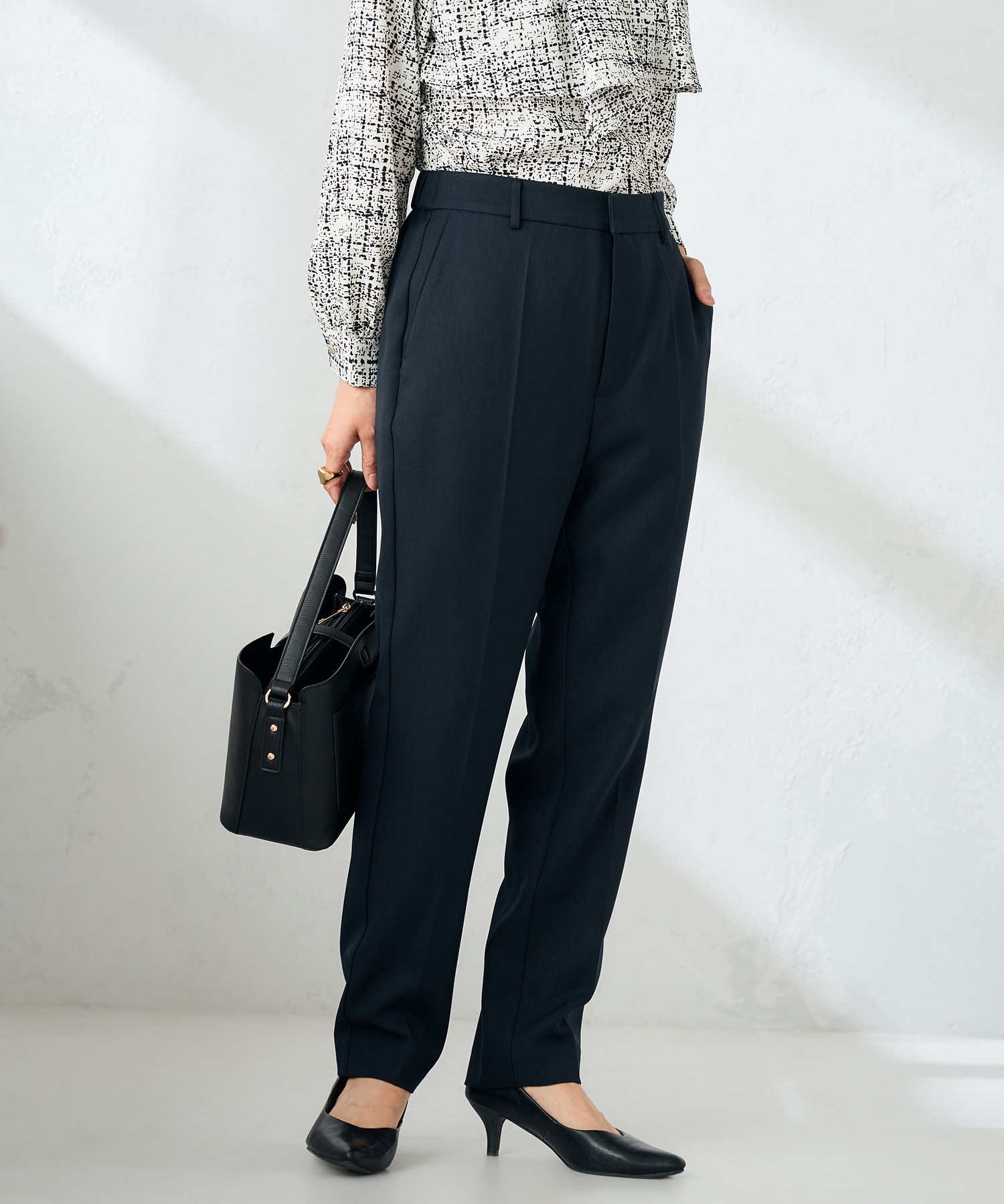 テーパードパンツですが、細すぎないキレイなシルエット。女性っぽくオシャレ見えし脚長効果があります!