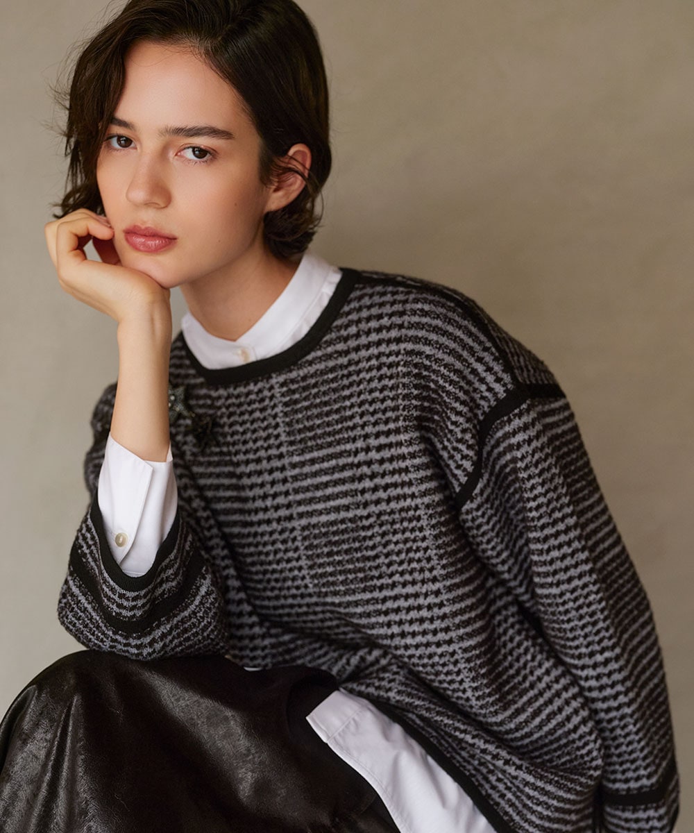 柔らかなブークレチェックジャカードニットは、立体感のあるクラシカルな柄とラインのアクセントで上品さを演出。