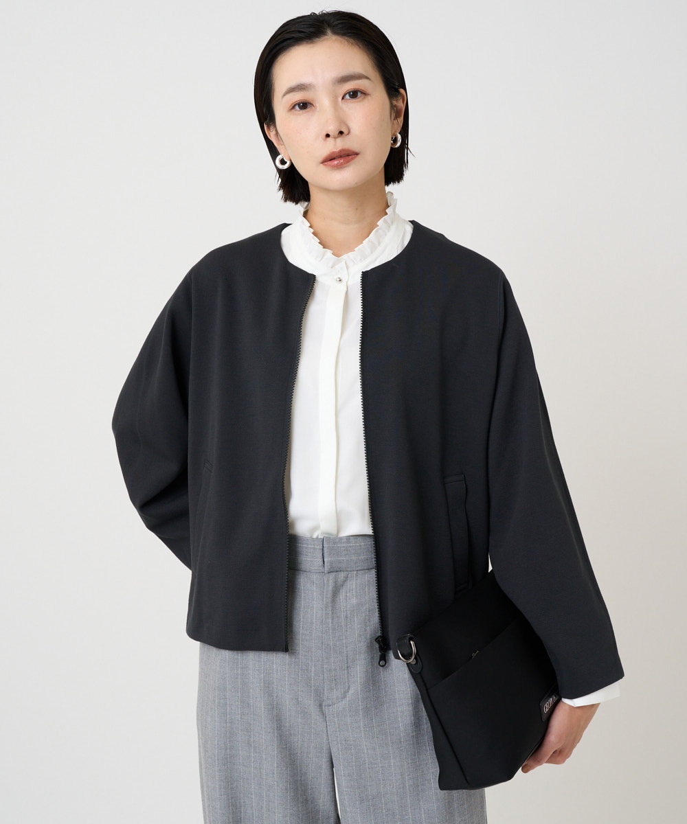 セットアップ対応のノーカラージャージージップ羽織は、きちんと見えながらもカーデ感覚で気軽に羽織れる便利アイテム。
