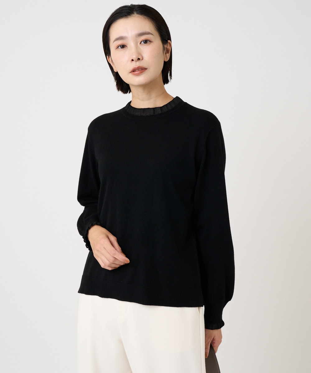 黒のニットプルオーバーはセミハイネックで、首元と袖口のシアーなフリルがポイント。