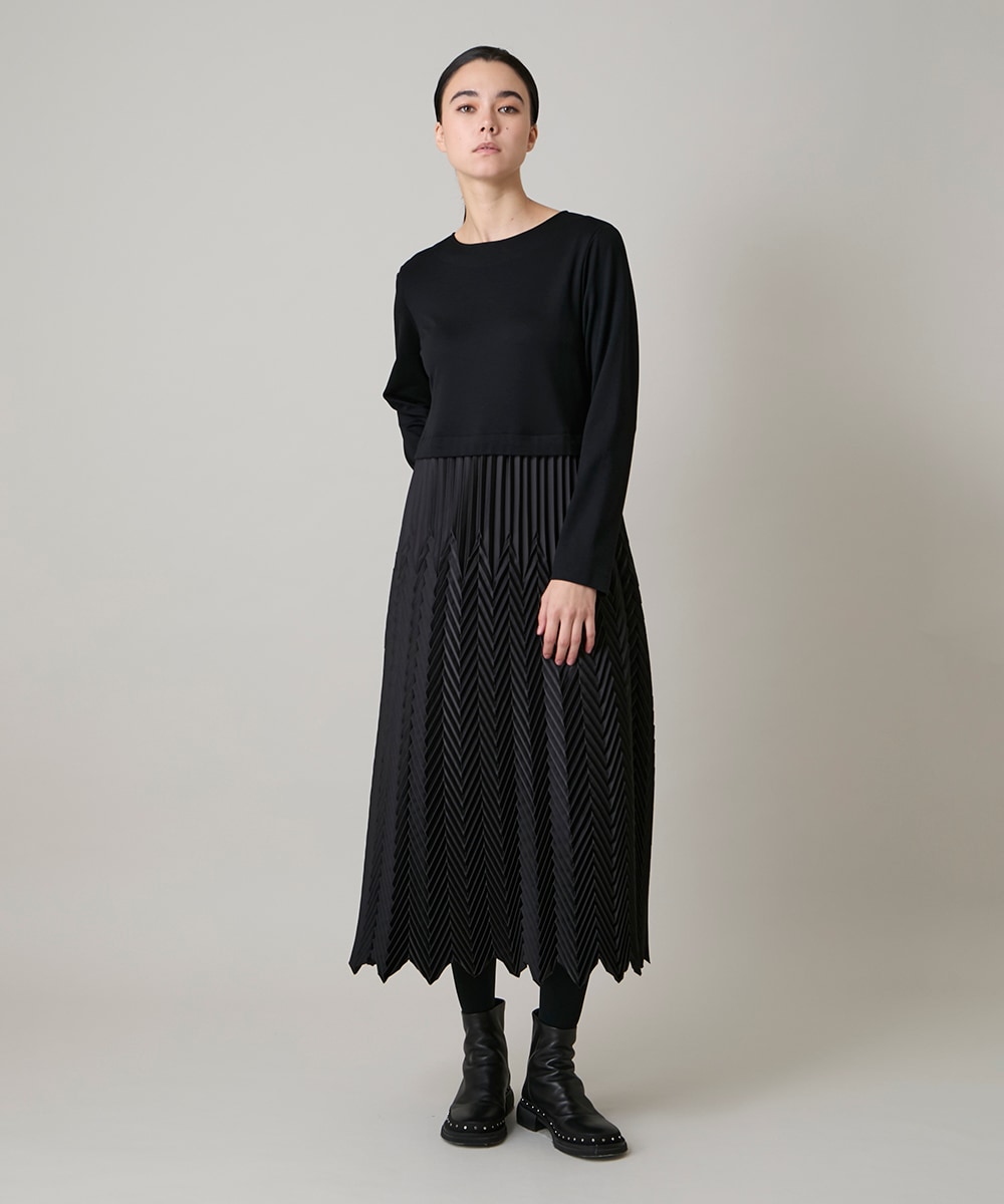 トップは柔らかいジャージー生地で仕立てたカジュアルな雰囲気ながら、サテンタフタの異素材スカートを合わせて印象的に仕上げた手の込んだ一枚です。リズム感のある矢振り柄の並びプリーツがエレガントな陰影をプラスし、立体的に演出。軽やかに着用できて季節を問わず 着用出来るおすすめのアイテムです。