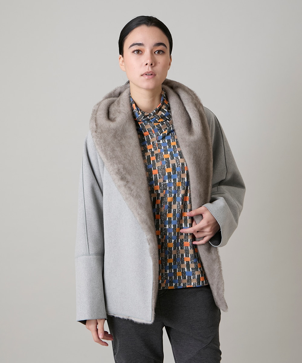 衿元は上品なグレージュのエコファーで顔周りは暖かく着用.