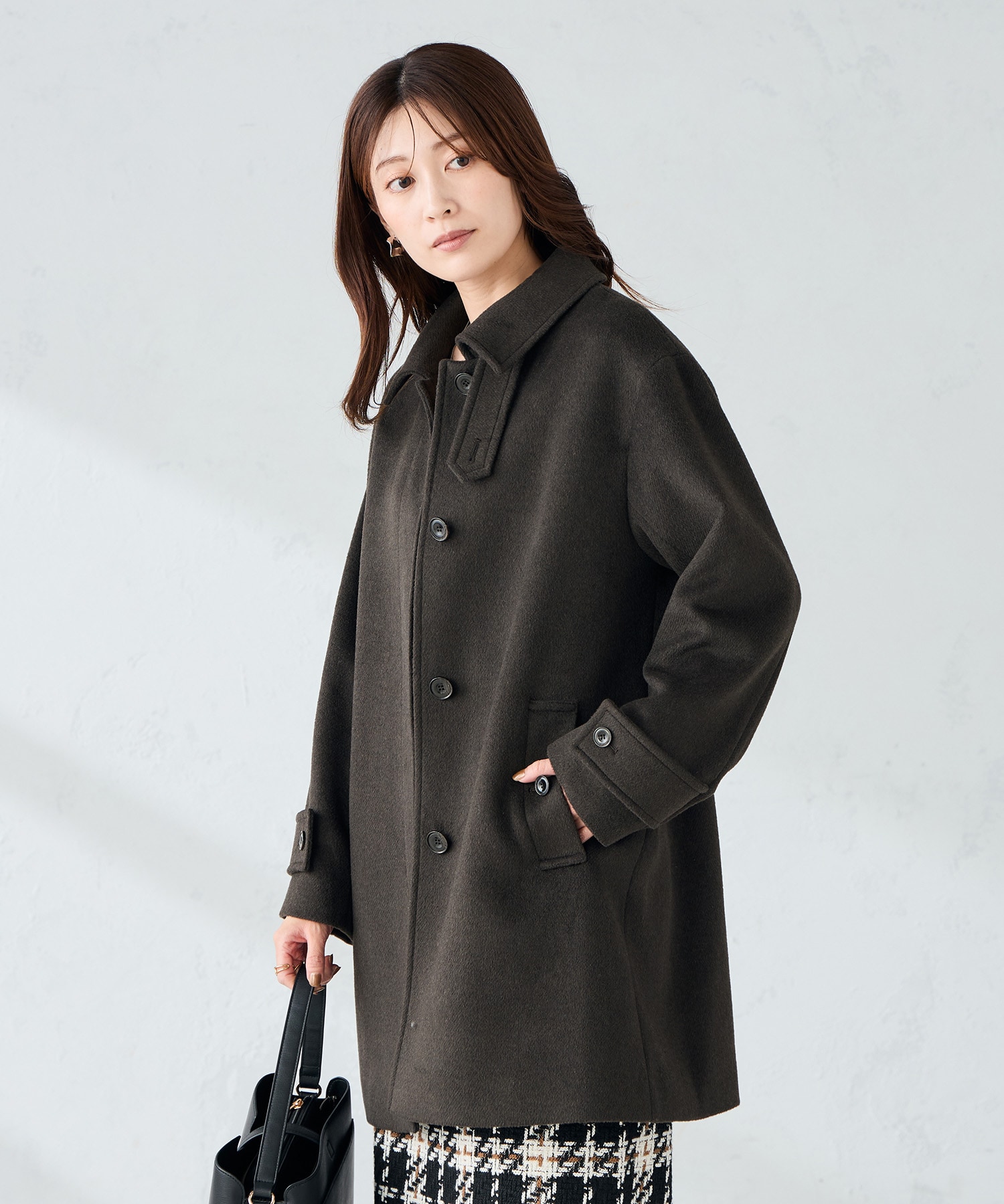 襟を立てるとハイネック仕様、折るとピーコートの様な抜け感があって、合わせやすく上品でとっても素敵なコートです。