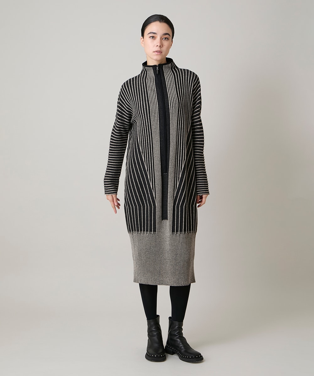 着痩効果抜群のニットワンピースです。凹凸感のある独特な編地が特徴です。ソフトなフィット感が心地よく、シワにならず、ロングシーズンで活躍します。立体感のある複雑なストライプ柄を組み合わせたきちんと感のあるニットとなっています。前・横・後と柄を楽しめます。コートを羽織った時も滑りが良く窮屈感もありません。前立てのジップを閉めるとシャープな印象に、開けてインナーを見せたりとスタイリングの幅が広がるワンピースです。