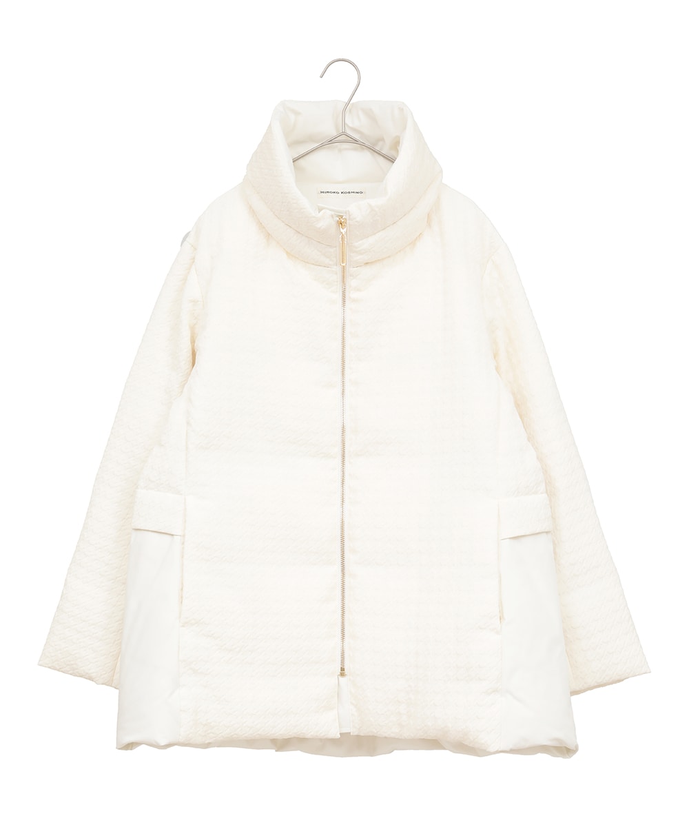軽量で保温性抜群のダウンジャケットは異素材ジョイントでエレガントな一枚です。パーツによってダウンの量が調整されていて、暖かさがありながら、動きやすく、すっきり見える計算されたシルエットです。さりげない千鳥格子柄のジャカード生地に光が当たった時の表情がとてもきれいです。高さのある襟でストールを巻かなくても暖かいです。インにジャケット着ることもできます。