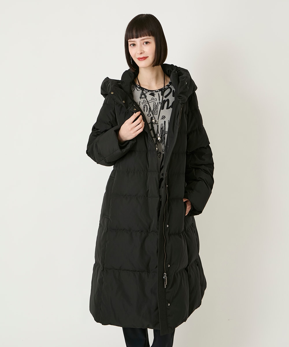 ロング丈フーディーダウンコートは軽やかで、マット仕上げの生地がカジュアルながらも大人の落ち着きを演出します。
