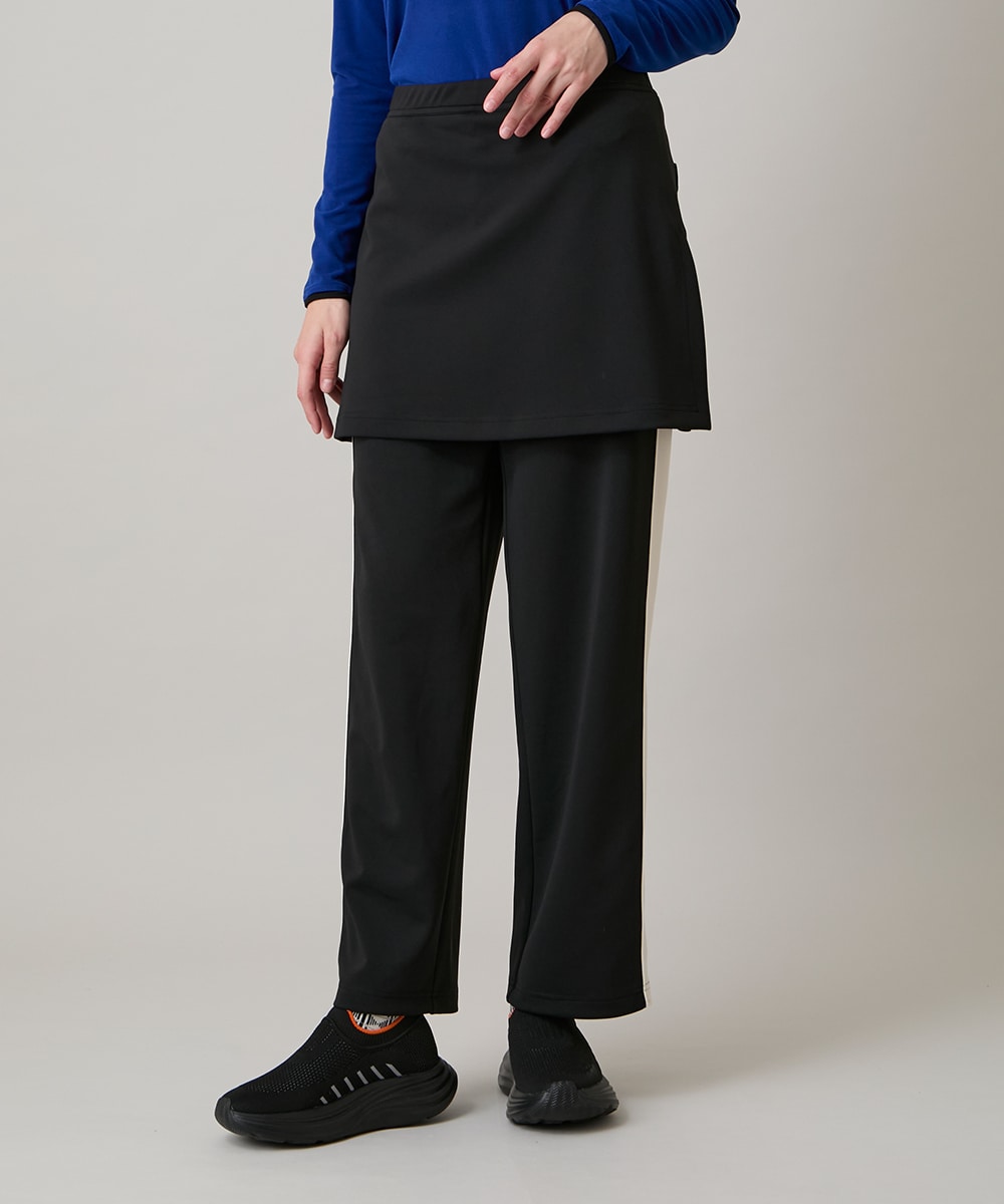 ぜひお試しいただきたいカバーパンツです。気になるお腹周りをカバースカートですっきり見せ、ウエストゴムでイージーな履き心地です。程よい厚さのダンボール素材で柔らかい風合いで落ち感があり、動いた時のシルエットがきれいです。ソフトなフィット感が心地良く脚の曲げ伸ばしがとても楽です。