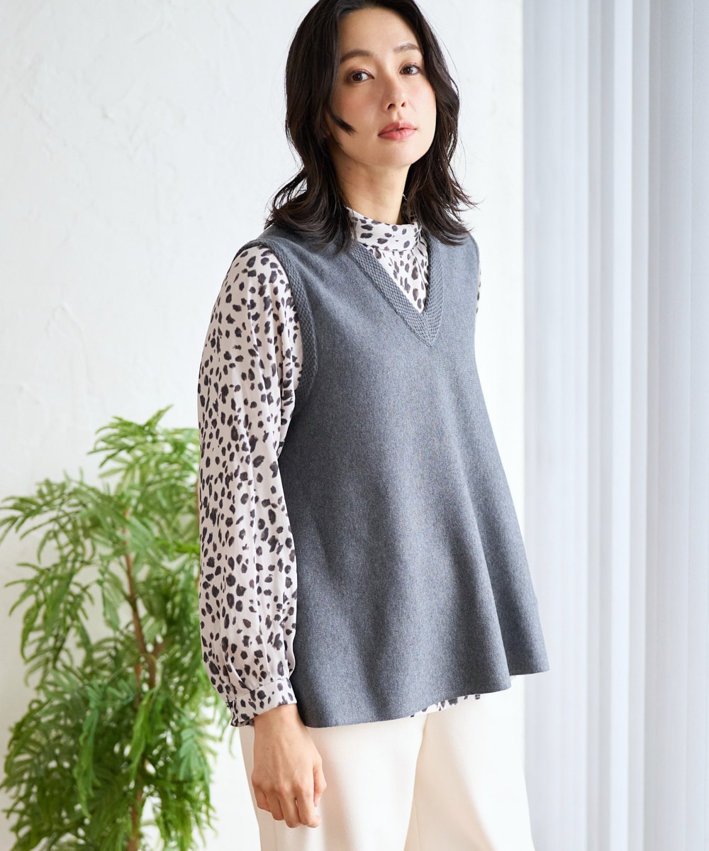 滑らかな引き返し編みのフレアニットベストは、深めのVネックが顔まわりをすっきりと見せ、ボディラインを優しく引き立てます。