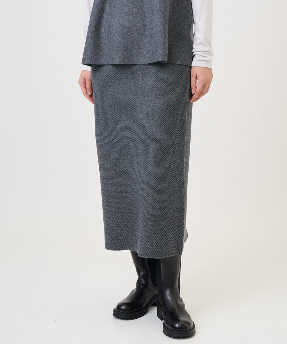 合わせるニットタイトスカートは、ウール混素材で温かみがありながらもシンプルなシルエットがシーンを選ばず活躍。適度なゆとりとフィット感が◎
