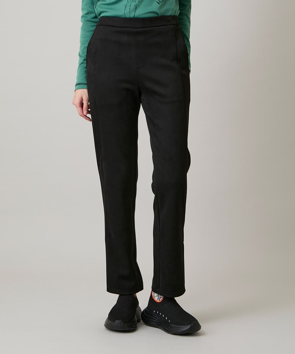 ボトムのスェード調の細身パンツはストレッチが効いていて、非常に履きやすいです。