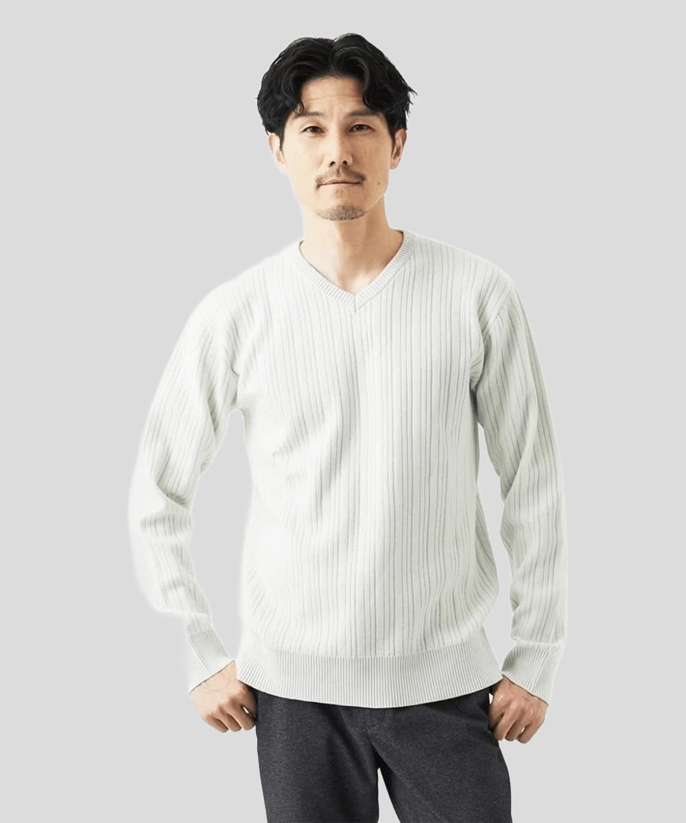 【Vネック/洗濯機で洗える】ランダムタック ストライプニット