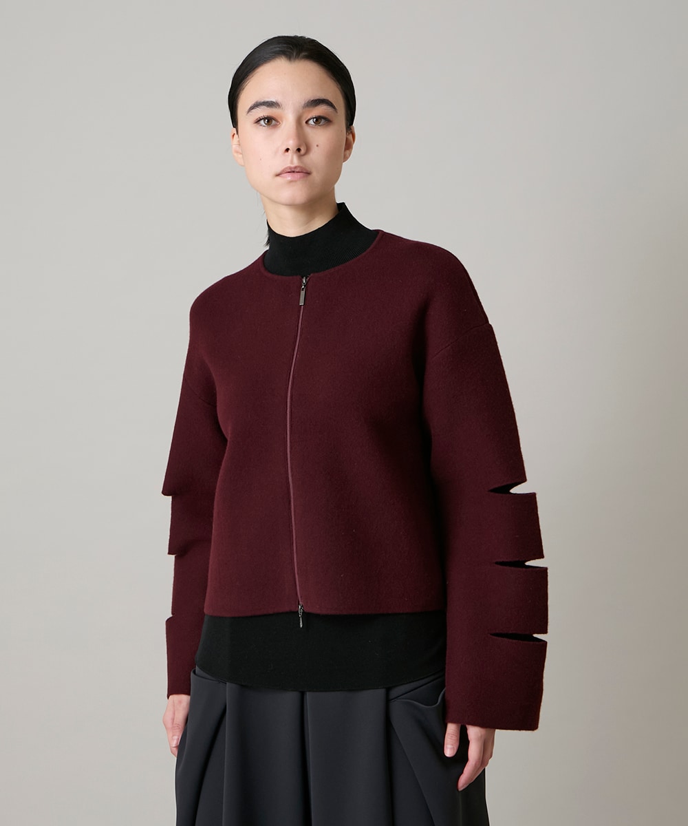 スラッシュデザインニットジャケットは構築的なフォルムとカッティングが立体感を演出し、軽やかで暖かみのある風合いが冬コーデに