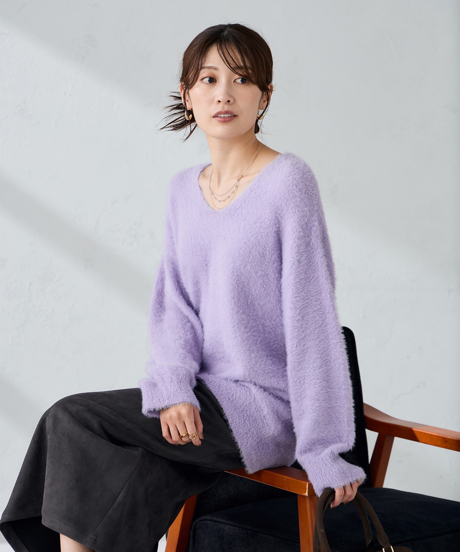 ・柔らかな風合いのフェザーヤーンニットはふんわりと女性らしいシルエットで華奢見え