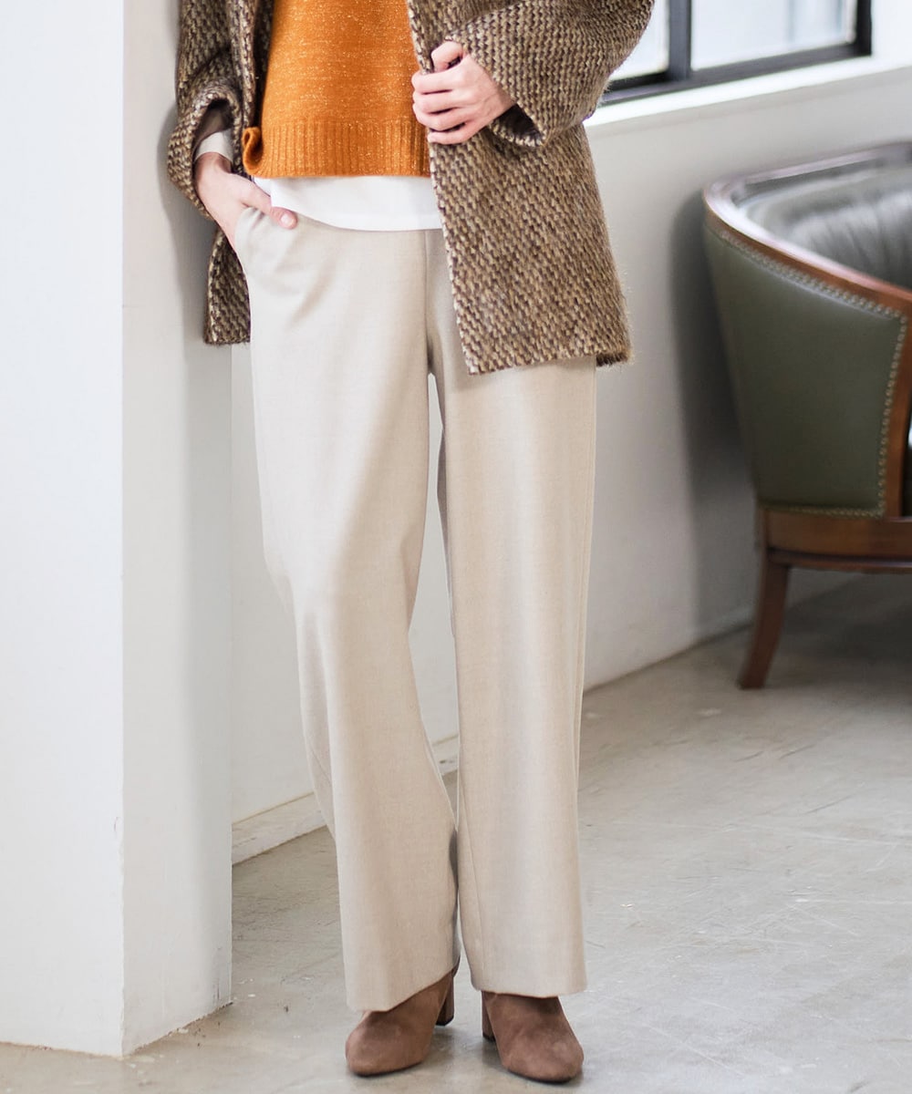 ウエストゴムセミワイドパンツは、ウール調の温かみと楽な穿き心地が魅力で、