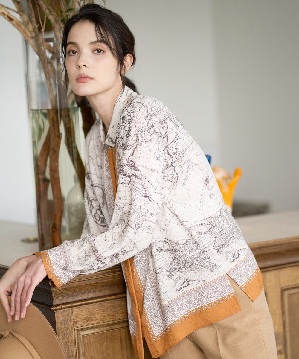 アートプリント長袖ブラウスにカシミヤシルクニットカーディガンをレイヤード。