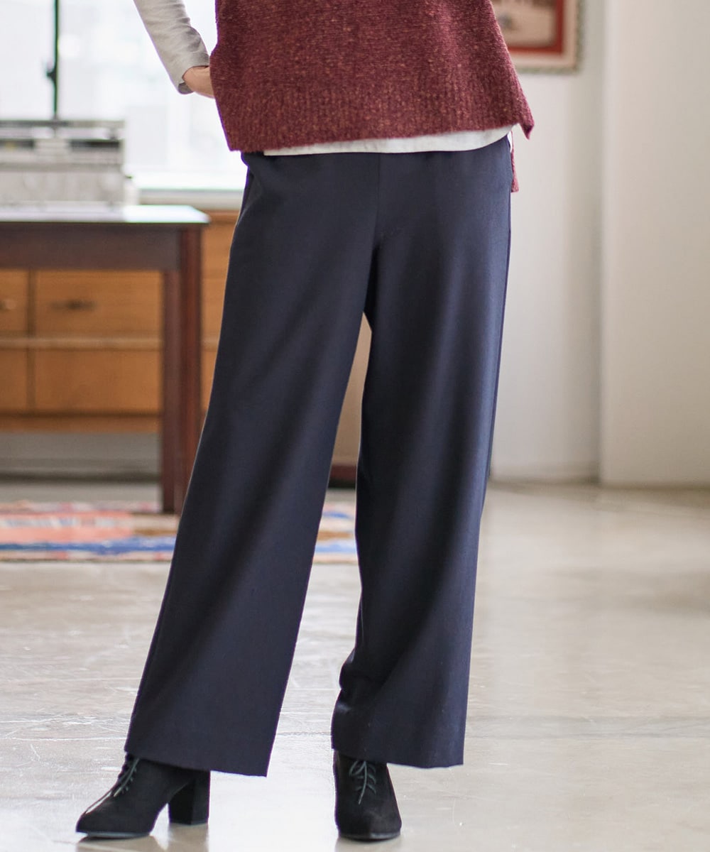 脇から後ろにかけてゴムを寄せたセミワイドシルエットで、動きやすさと洗練された印象を両立。