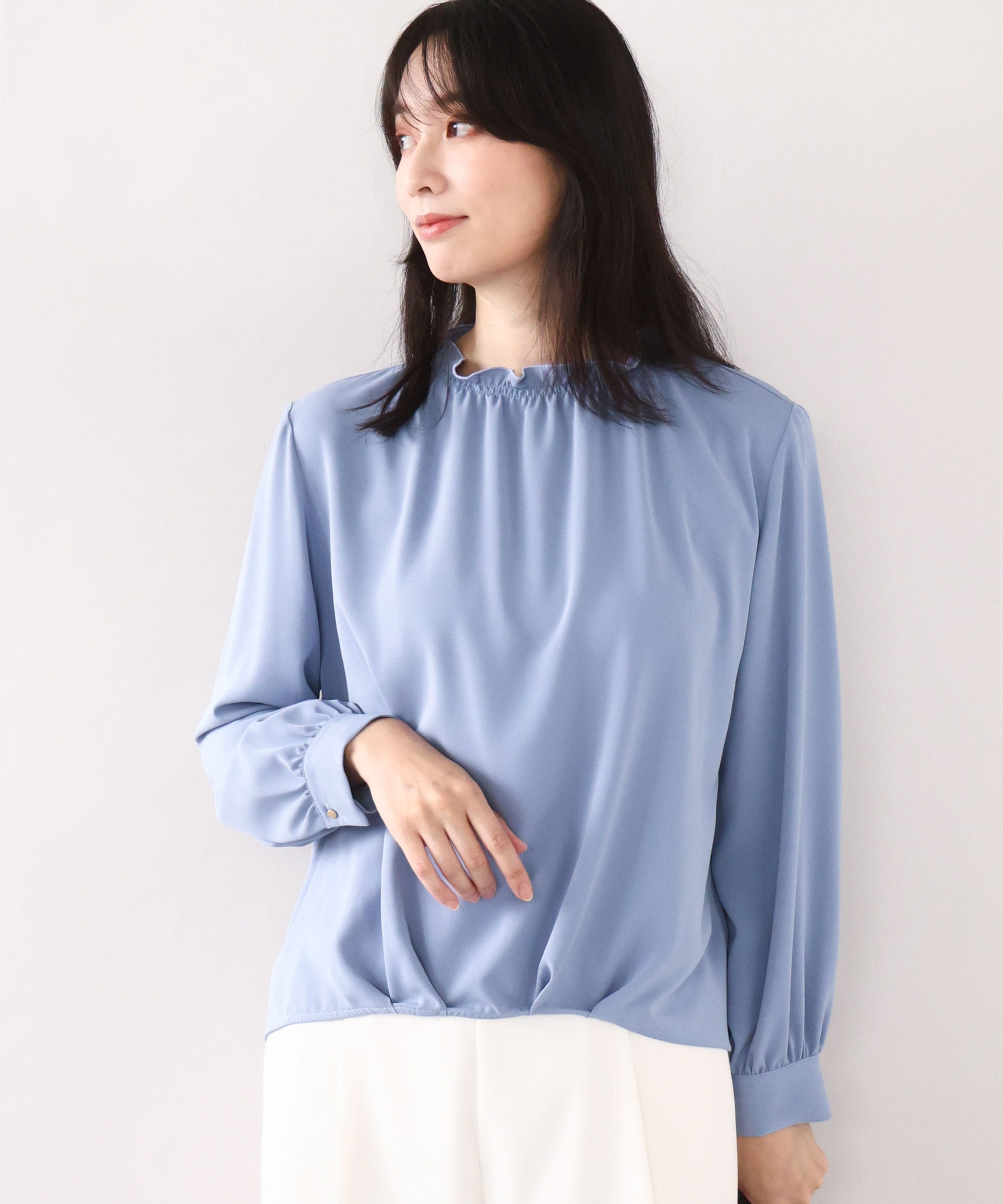 深めのVネックが顔まわりをすっきり見せ、フレアシルエットが女性らしさを引き立ててくれます。