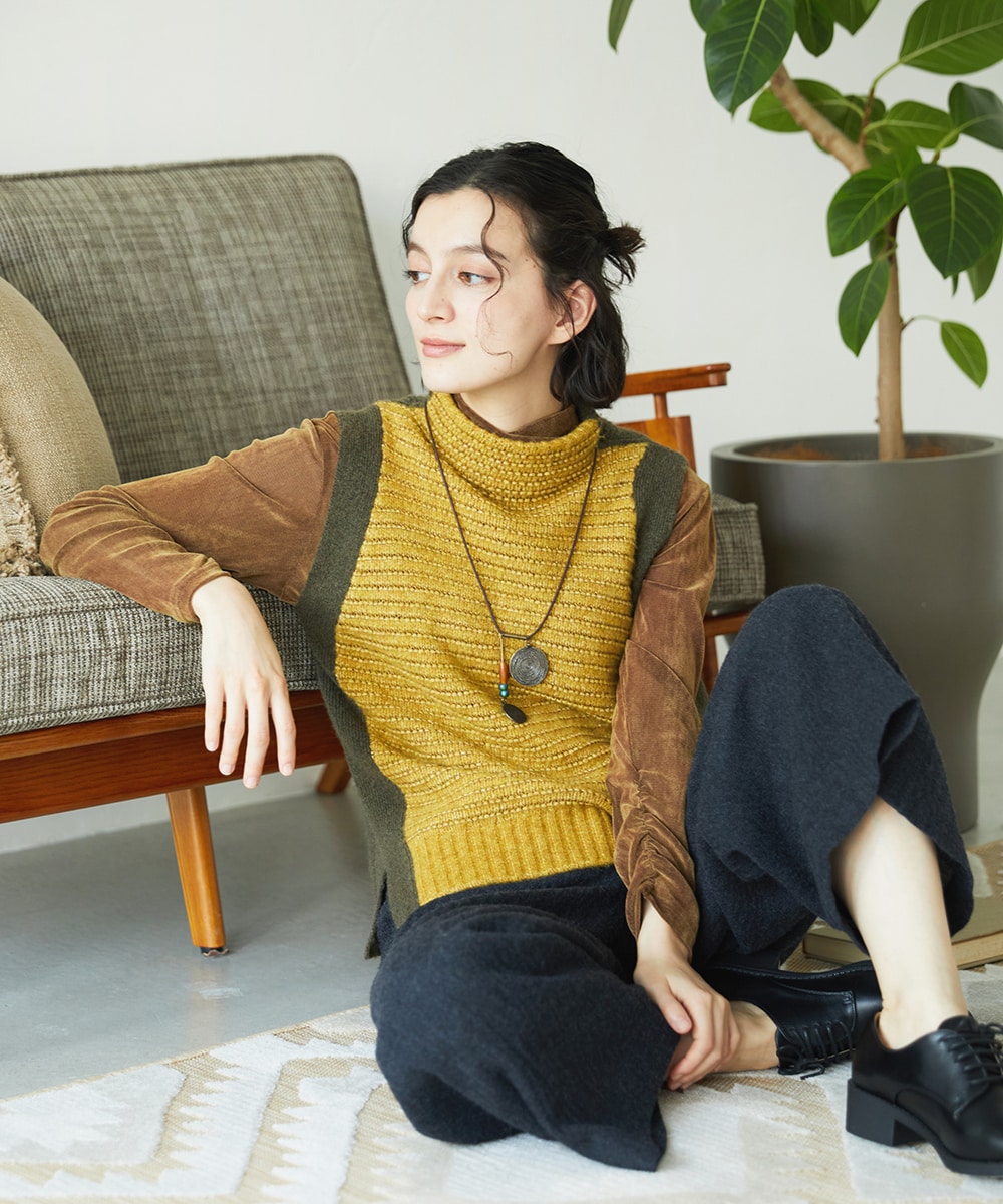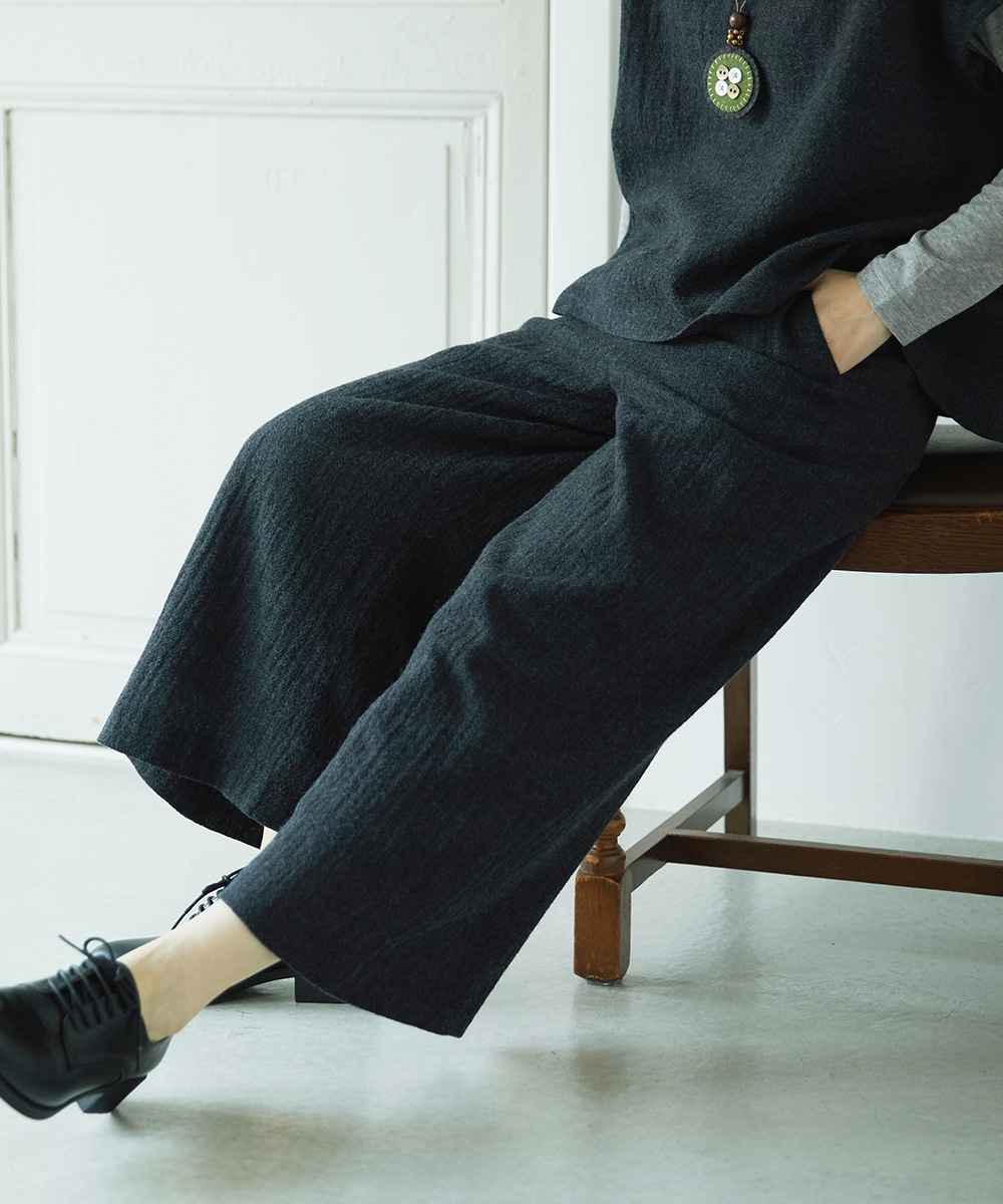 ほっこりとしたニットベストに、ナチュラル感のあるパンツを合わせた大人リラクシーコーデ。