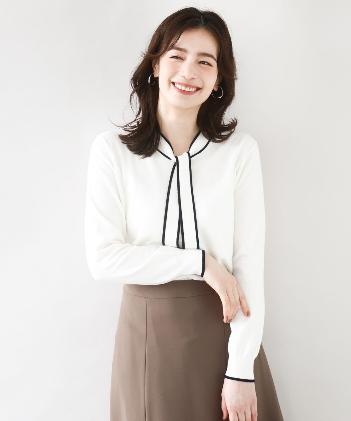 配色ライン入りのボウタイニットと合わせれば、クールかつエレガントな大人の着こなしが完成。