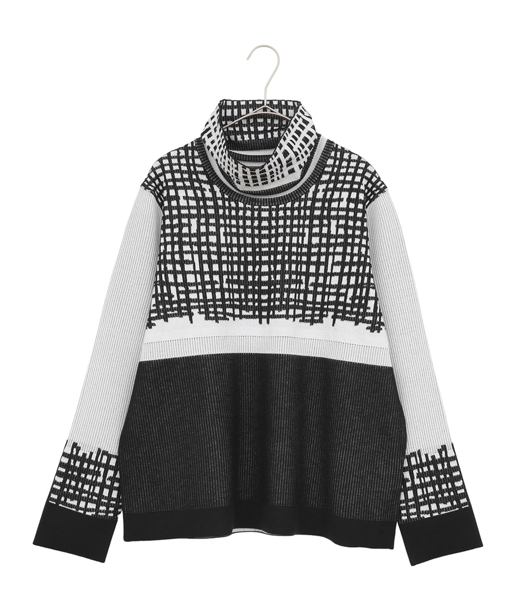 ジャカード織りのチェック柄と縦ラインを強調する針抜きデザインが、縦長効果とおしゃれ感をプラス。