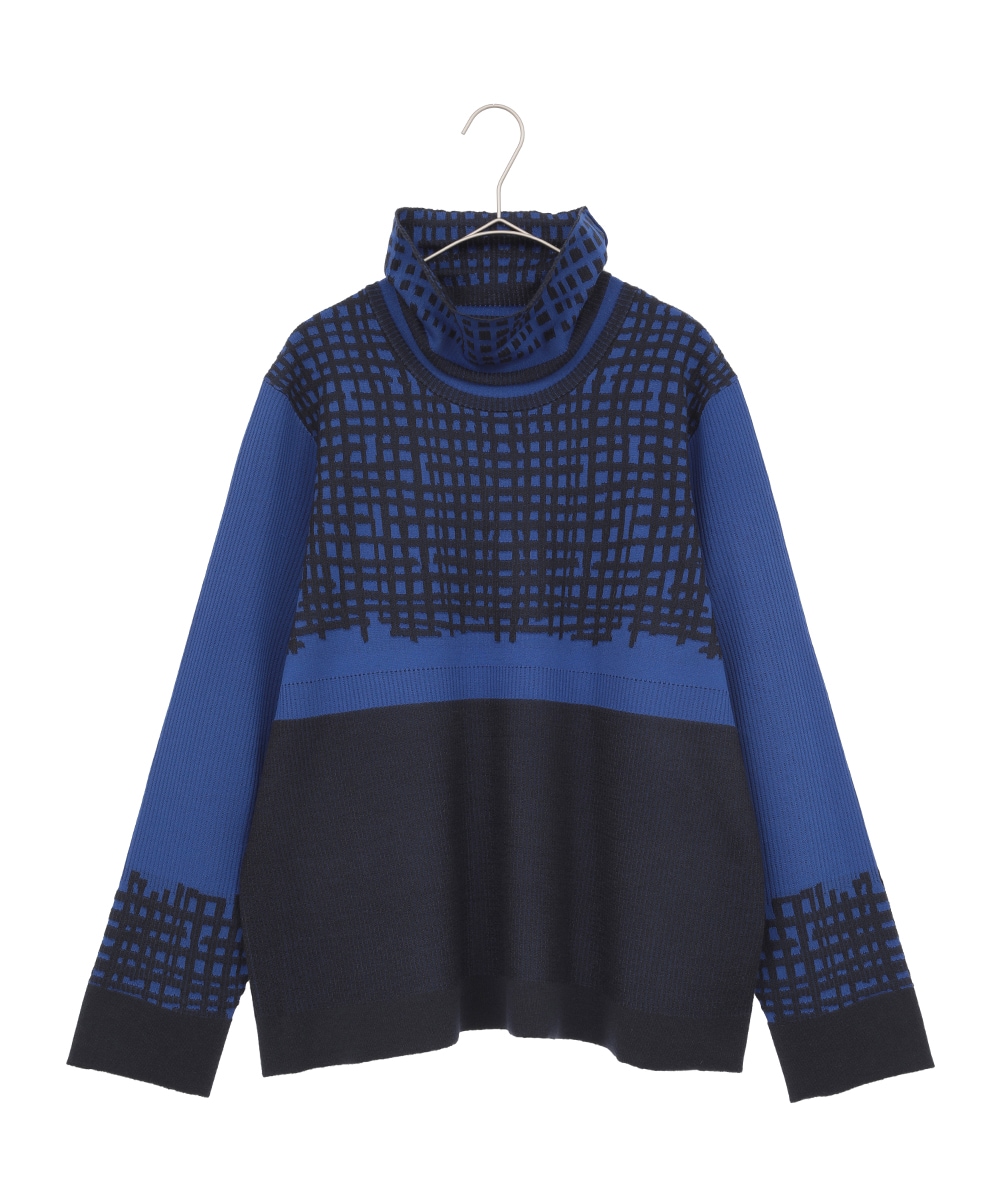 ジャカード織の手描きチェック柄がポイントになったニット。柔らかく肌触りのよい極細の素材です。薄手なのでジャケットなどのインナーにもピッタリ。