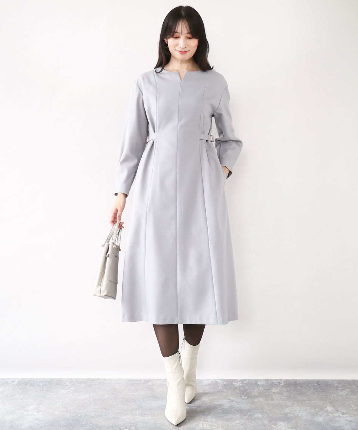 フロントのキーネックとウエスト左右のベルトがポイントで、締め具合を調整できるため、体型に合わせてきれいなシルエットを演出します。