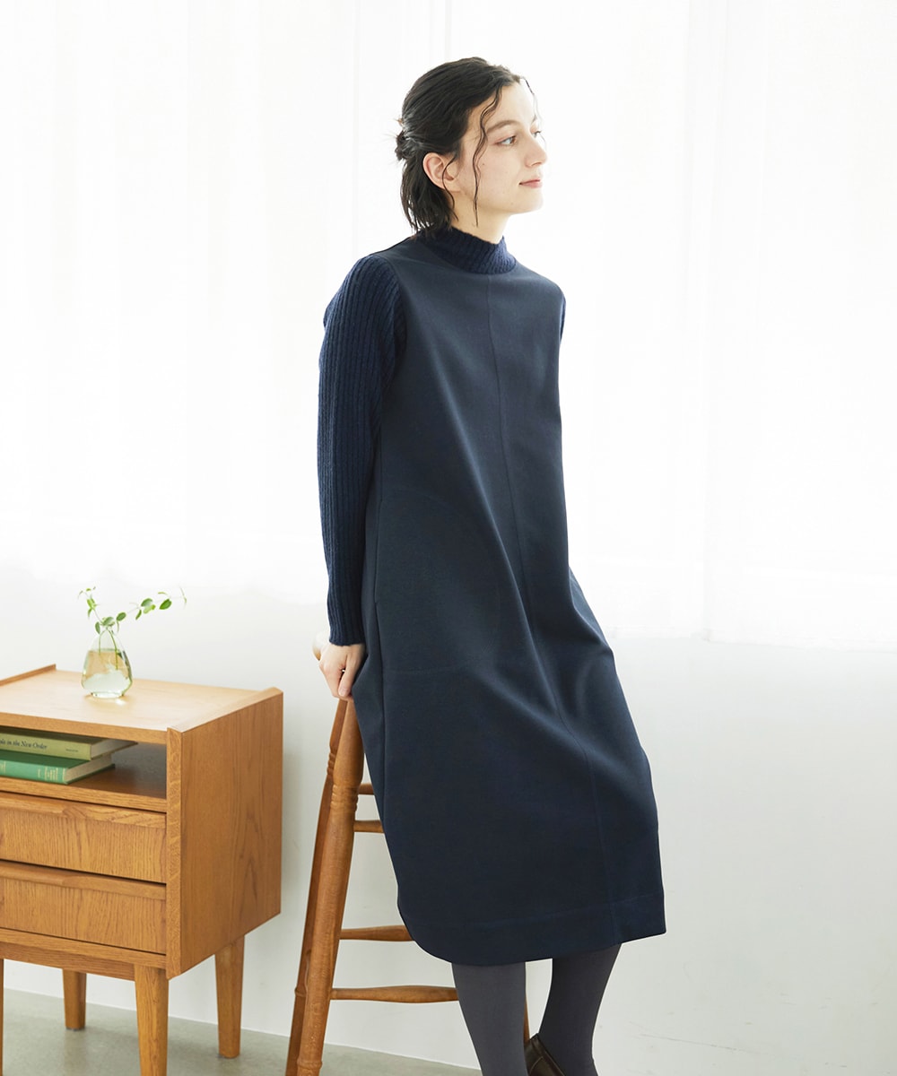 MEETとのコラボワンピースは、ジャージー素材のシンプルなシルエットにダンボールニットを使用し、動きやすさと快適さを実現。