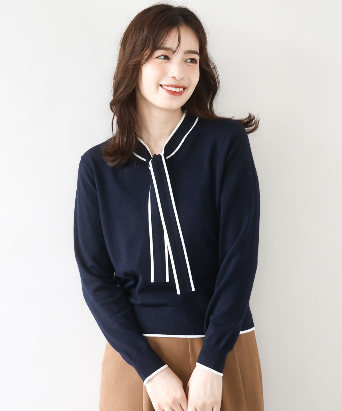 上品な配色ラインがアクセントのボウタイニットは、きれいめなデザインで大人のエレガントなコーディネートに最適です。