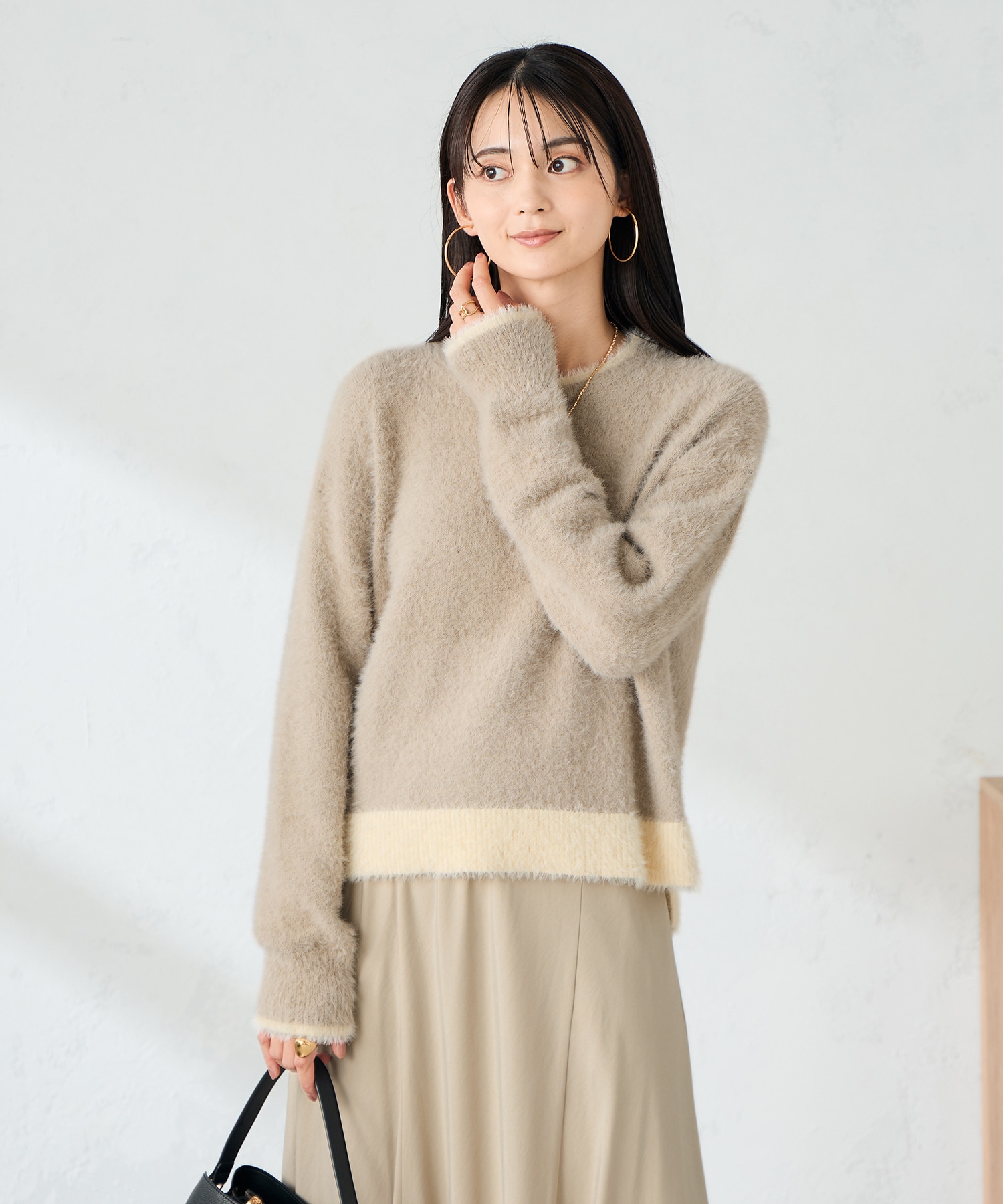 ボトムのパンツはツイード調でお色もベージュMixでオシャレ!ワイドストレートですっきり見え効果あります。
