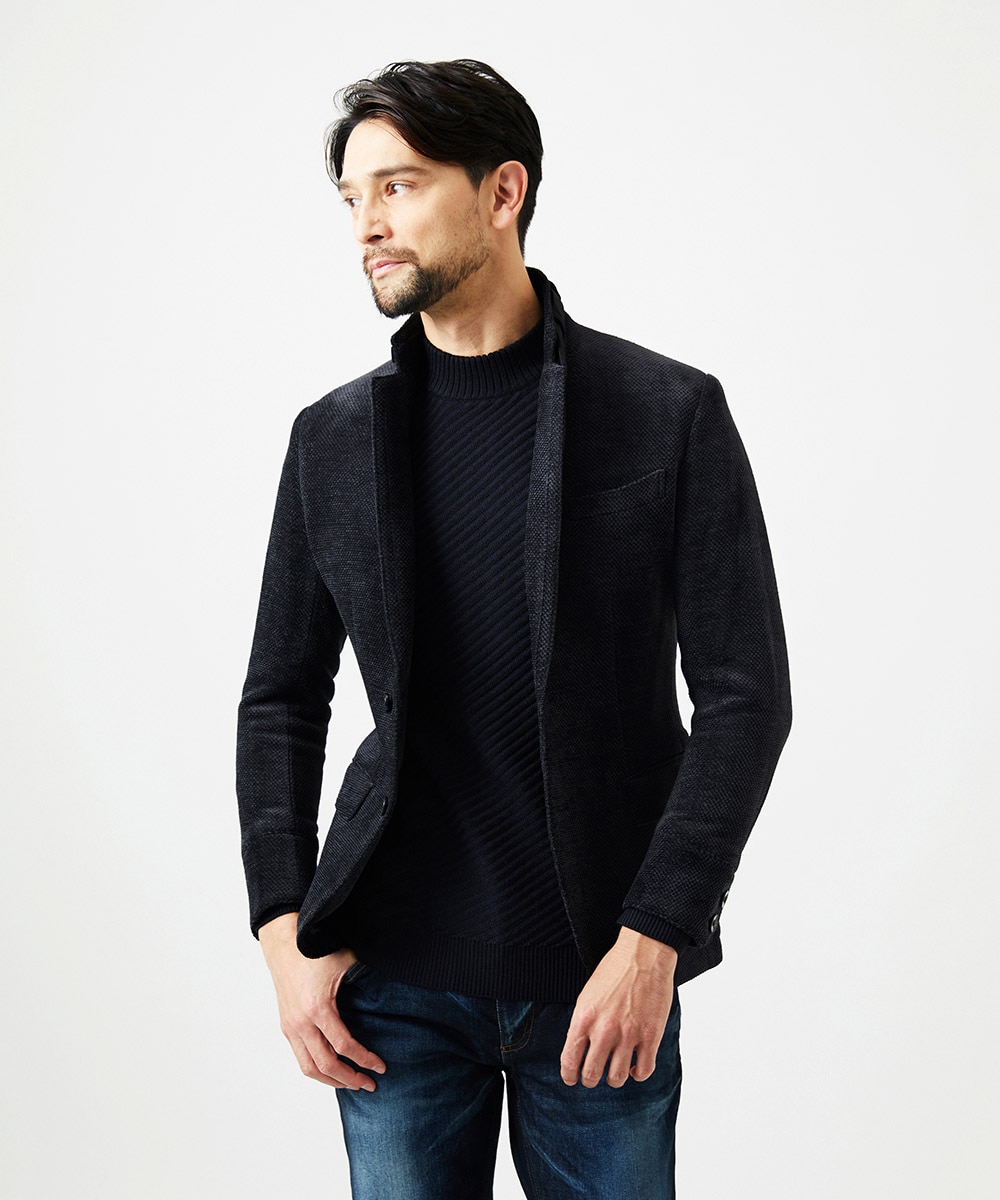 襟を立ててカジュアルスタイル、襟を寝かせてジャケットスタイル