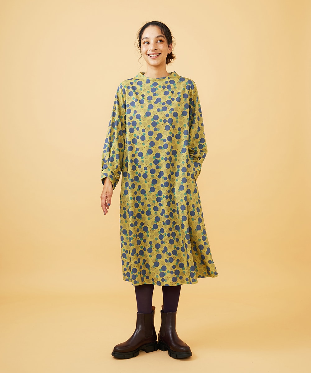 ストレッチ性のあるカットソー生地に、多色のランダムドット柄をプリント。カフス部分がクロスしている変形デザインがポイントです。カラフルで目を引くデザインながら、シンプルなフレアラインで動きやすさを実現。旅行やお出かけにも最適です。