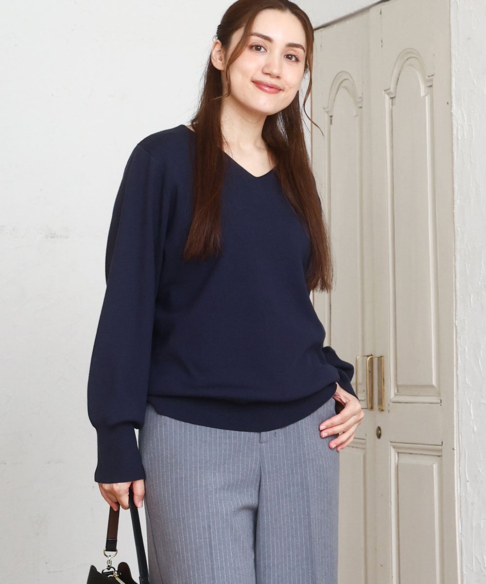 Vネックパフスリーブニット