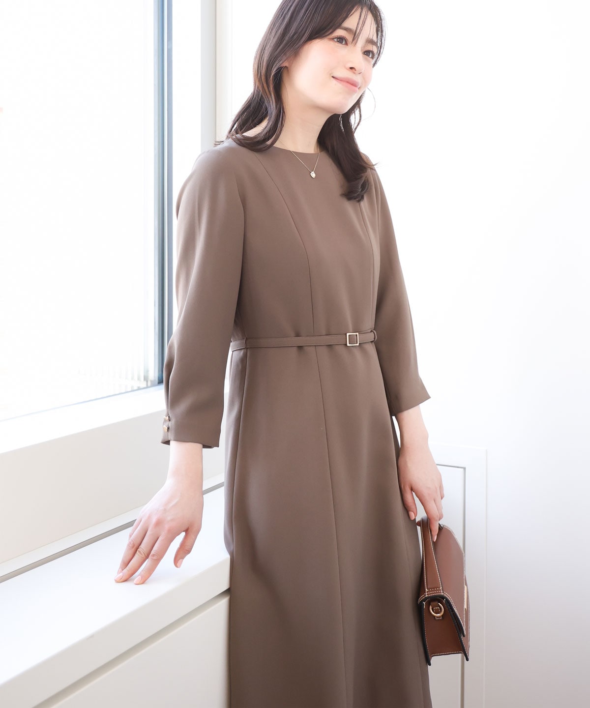 さらに、[ベルト付きタックワンピース]は、上品なシルエットを引き立てるウエストのタックと細めのベルトがポイントで、セットアップでの着用も可能です。