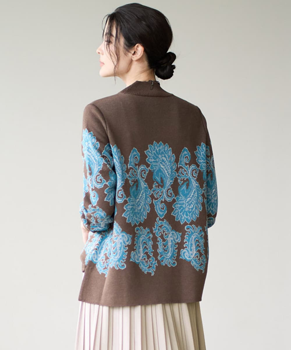 薄手のジャガードのハイネックプルオーバーはミドルヒップ下の丈感です。