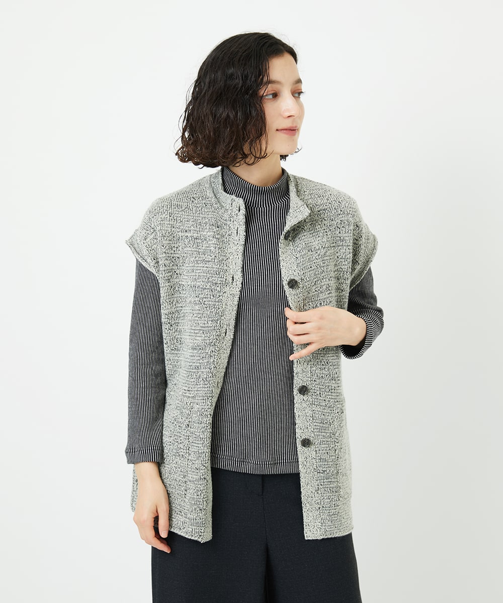 中にはジャンニ ロ ジュディチェで人気素材「シーレ」のロングニットジレを合わせました。