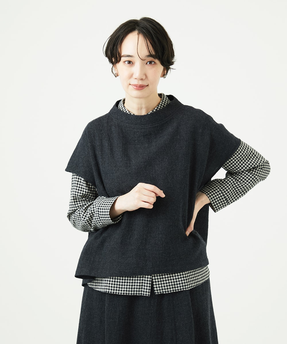 体型カバーに優れたボックスシルエットのベストブラウスは、軽やかなリファインガーゼ素材でふんわりとした着心地とシンプルながら上品なデザインが魅力。