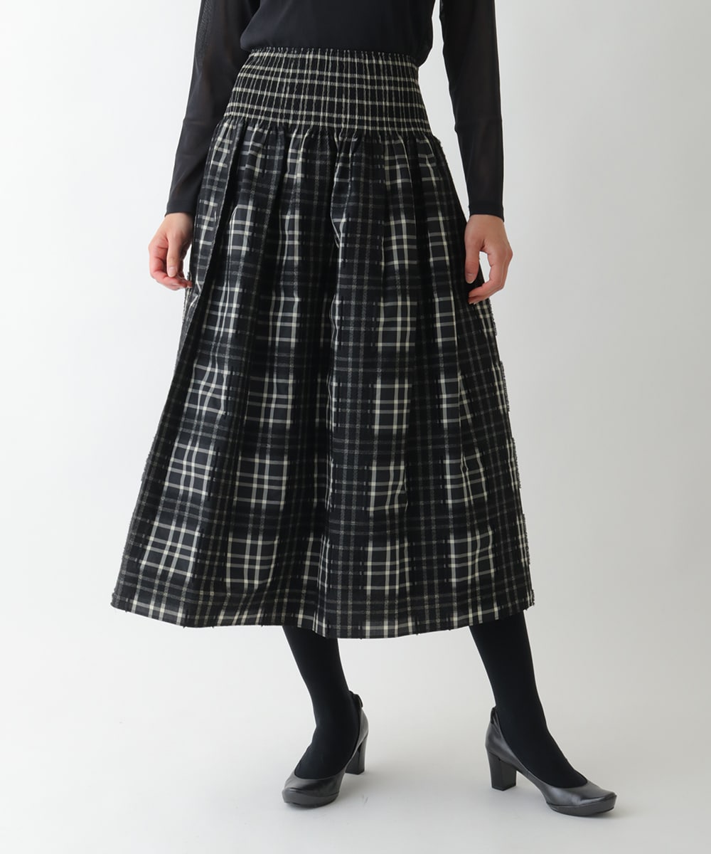 スカートはフィットフレアのシルエットに、ジャカード素材のチェック柄を採用し、ギャザーたっぷりのウエストデザインで女性らしい華やかさを演出します。