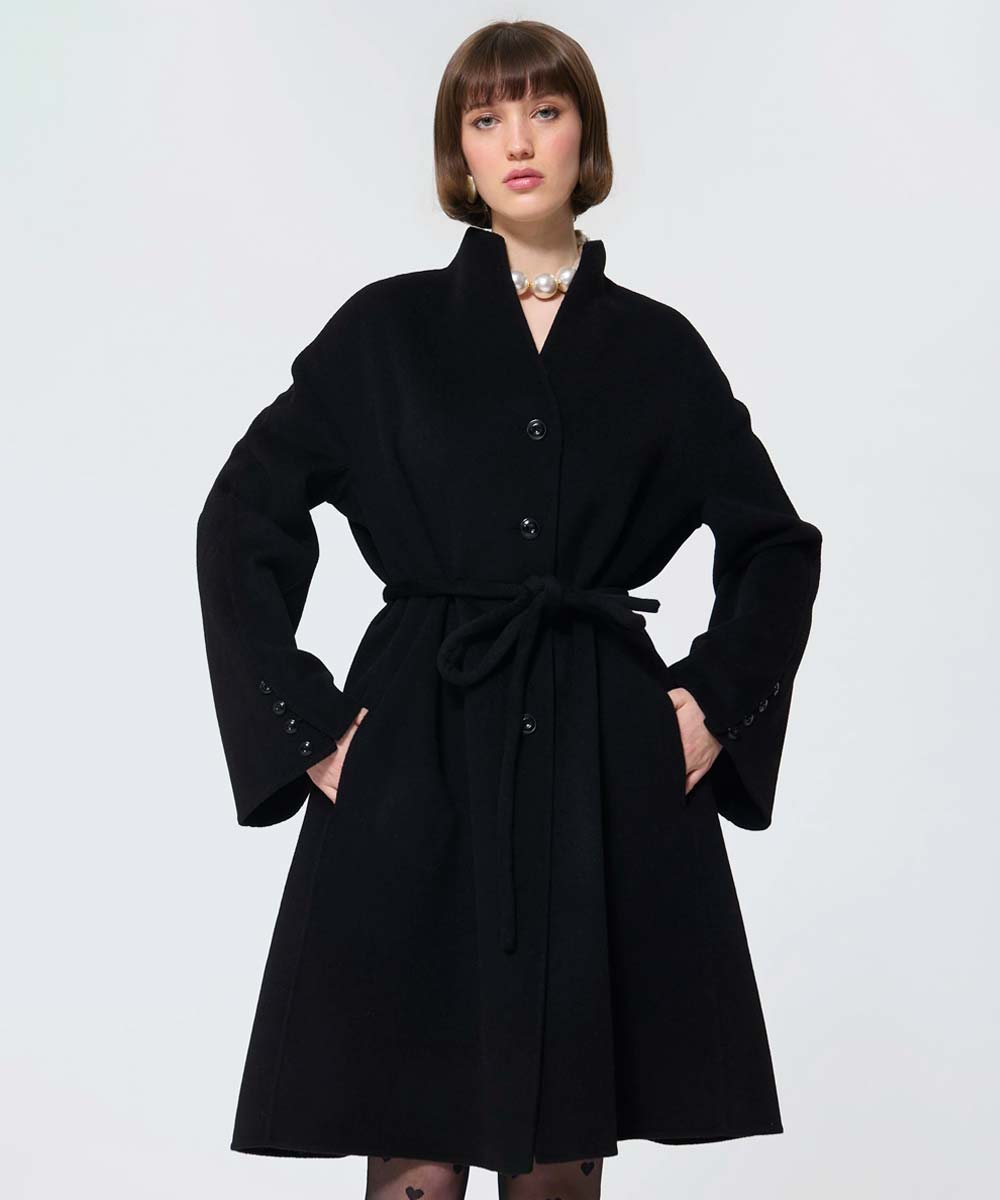 特徴的なネックラインや、ボタンのついたフレアスリーブ、丸紐でつくるフィットアンドフレアのシルエットなど、TARA JARMONらしいこだわりをつめた一枚です