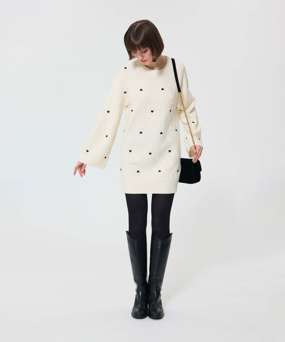格子柄の編み地とハートの刺繍で着映えするニットワンピース